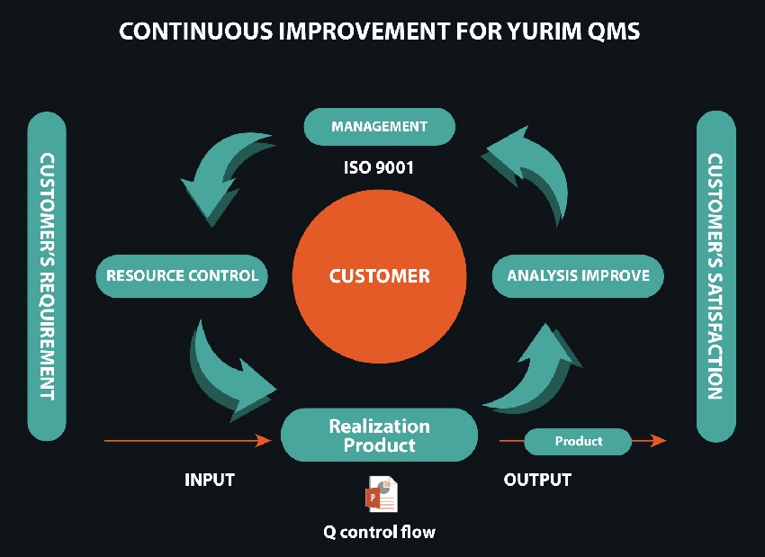 YURIM SOLUTION CO.,LTD. has been setting up Yurim QMS(quality assurance management system) since 2008. Yurim QMS based on customers’ requirements goes to customers’ satisfactions with our values, “Passion, Dedication, and Innovation”. Yurim QMS principally follows ISO 9001 as belows.